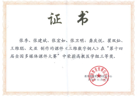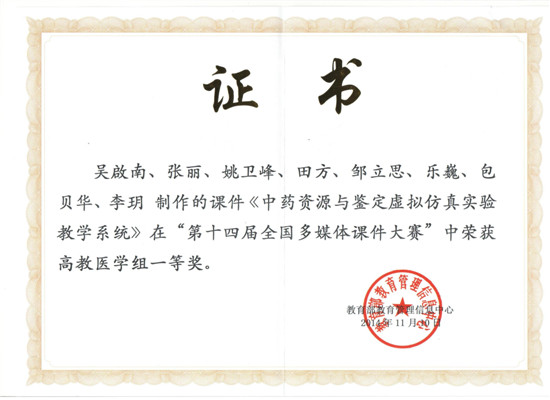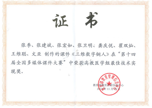 我校吴啟南、张丽、姚卫峰、田方、邹立思、乐巍、包贝华、李玥老师制作的《中药资源与鉴定虚拟仿真实验教学系统》获高教医学组一等奖,张季、张建斌、张宏如、张卫明、龚庆悦、翟双灿、王维聪、文亚老师制作的《三维数字铜人》获高教医学组三等奖和最佳技术实现奖两项奖项,王瑞娟、翟双灿、印志鸿、张卫明、董海艳、张季、龚庆悦、顾铮老师制作的《计算机网络课程学习平台》获高教工科组三等奖。