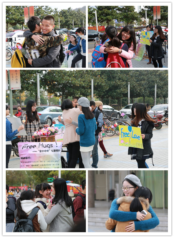 本次活动的灵感来源于美国人贾森·亨特的“Free hugs”活动。一个个温暖的、久违的拥抱,不仅拉近了同学们之间的距离,而且传达了“拒绝冷漠、与爱同行”的精神。