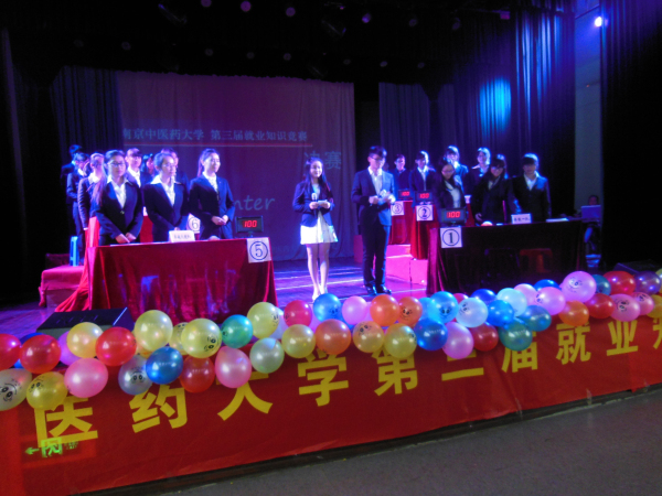 2014年12月3日晚,由校学生工作处主办,药学院承办的南京中医药大学第三届就业知识竞赛在大活小剧场成功举行。全校共八支代表队参加决赛,决赛现场共分为共答题、必答题、抢答题和风险题四个环节。在共答题环节中,各队成员积极参与、相互协作,均表现不俗。第二环节必答题紧接着展开,经过激烈比拼,维克托队、携手共进队和主旋律队均以高分暂时取得领先地位。比赛中穿插的观众有奖竞答环节,使现场观众热情高涨,现场气氛十分热烈。在随后的抢答题环节,主旋律队和携手共进队凭借她们出色的抢题能力和技巧,拉开了差距,遥遥领先于其他队伍。最后一个环节为风险题,该环节从职业规划、职业礼仪等诸多方面用提问或故事的形式考参赛选手,这对团队的协作能力,思考变通能力都有极高的要求。