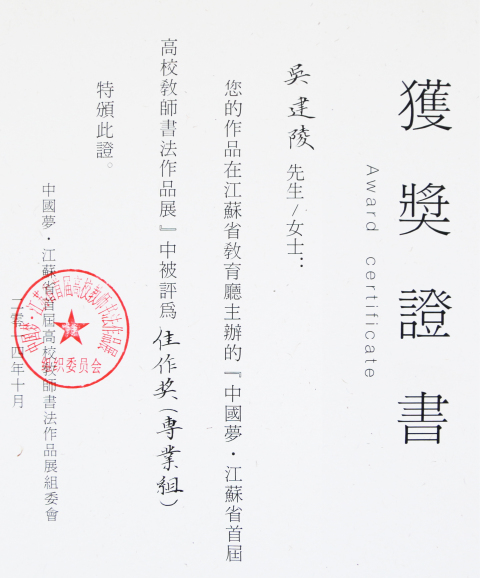 日前,在江苏省教育厅主办的“中国梦 江苏省首届高校教师书法作品展”上,由我校选送的党委宣传部吴建陵老师的作品,经过专家评委认真严格评审,获专业组佳作奖(专业组唯一奖项)。