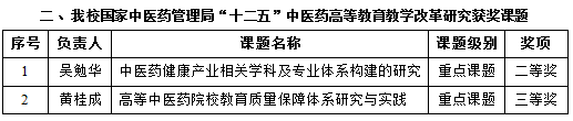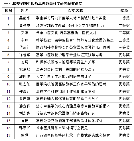 从12月28日召开的全国中医药高等教育学会成立25周年学术成果报告会上传来喜讯,会议对评选出的全国中医药高等教育科学研究获奖论文进行了表彰,我校荣获一等奖1项、二等奖3项、三等奖1项、优秀奖12项。同时,在国家中医药管理局“十二五”中医药高等教育教学改革研究28个获奖课题中,我校荣获二等奖1项、三等奖1项。