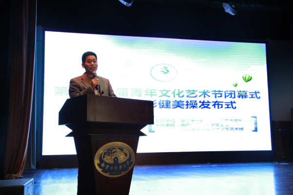 最后,学校王长青副书记、副校长发表了热情洋溢讲话,他高度评价了本届青年文化艺术节为丰富校园文化所做出的贡献,还指出三走塑形健美操的发布是打开了新的窗口,能够很好的倡导同学们塑形健身,加强体质锻炼,号召全体同学走下网络、走出宿舍、走向操场,拥抱阳光快乐生活。