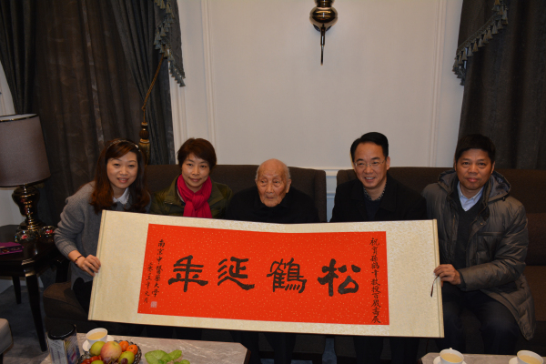 孙鹤年教授是我校药学院老一辈专家,长期从事药用植物栽培的教学科研工作,为传统中医药理论结合现代医药学知识的中药高等教育课程体系和人才培养模式的确立作出了重要贡献。程革副校长一行首先请孙老观看了陈涤平书记代表学校党委、行政对孙老百年寿辰的祝福视频,陈书记在视频中对孙老多年来为学校所作的贡献表示衷心感谢,向孙老百岁寿辰表示热烈祝贺!之后程校长向孙老赠送了学校的百岁生日礼物——“松鹤延年”书法作品、全校师生的祝贺横幅以及校庆资料。孙老精神矍铄地与程校长进行了交流,回忆南中医的过去,喜看南中医的发展,对学校领导和全体师生的关心表示感谢,祝愿南中医在中医药事业上取得更大的发展和辉煌的成就。