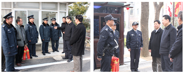 陈书记、胡校长一行仔细察看了仙林校区北大门、西校门以及汉中门校区的安保情况,亲切的与在岗保安们一一握手问好,并送上新春的祝福。陈书记、胡校长对大家的工作充分肯定,嘱咐大家要再接再厉,确保节假日校园安全。