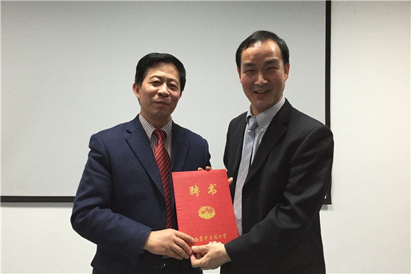 胡刚校长(左)代表学校向张樟进教授颁发客座教授聘书