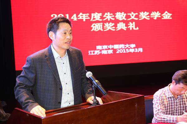 颁奖典礼上,刘晓主任宣读了《南京中医药大学2014年度朱敬文奖学金表彰决定》。基金会代表朱承德先生和赵阳主任分别讲话。朱承德先生在讲话中感谢学校老师在奖助学金评选方面的辛勤付出,并对获奖同学表达了美好祝愿,朱先生鼓励所有获奖受助同学能继续发奋图强、拼搏进取,将敬文精神发扬光大。赵阳主任则深情地回忆了朱敬文先生倾其所有为国储才、助教兴学、无私奉献的一生,以及其家人继承朱敬文先生遗志,崇教助学的善举,特别是朱敬文先生的长子朱恩馀先生,已是一位耄耋老人,但仍然辛勤在公司工作,为基金会项目能够继续延续辛劳奔波。赵阳主任希望通过和获奖同学分享朱敬文先生及其家人捐资助学的善举故事,使大家能从中汲取到朱先生丰厚的精神营养,在今后的学习和生活中进一步以实际行动传递正能量。