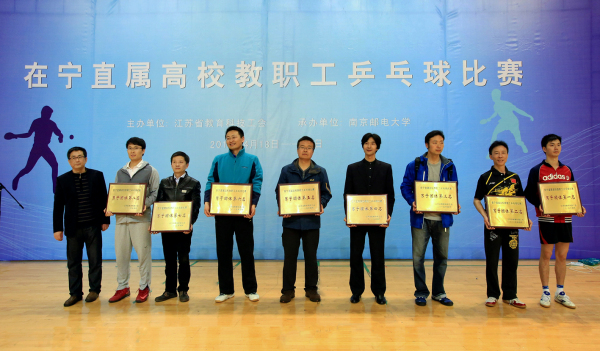 4月18、19日,由江苏省教育科技工会主办、南京邮电大学承办的在宁直属高校教职工乒乓球比赛在南京邮电大学仙林体育馆开赛。这次比赛共有30个高校代表队参加,强手云集,经过激烈的角逐,我校男子乒乓球队荣获男子团体第三名,蔡任获得男子乒乓球单打第三名,刷新了我校参赛历史最好成绩。