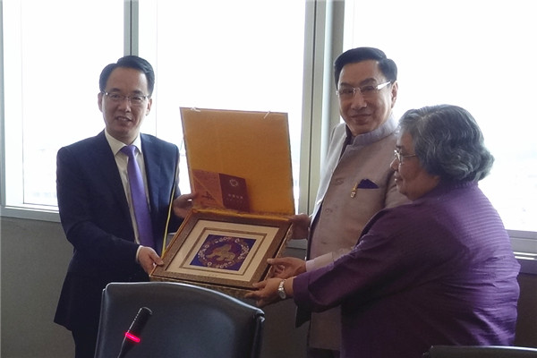 程革副校长(左)向兰实大学Dr. Arthit Ourairat校长(中)赠送纪念品