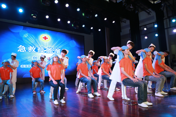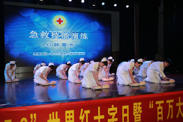 在启动仪式上,来自我校护理学院的学生现场进行了心肺复苏演示、创伤包扎演示、应急救护队急救情景剧演示,生动体现了红十字会“人道、博爱、奉献”的精神。