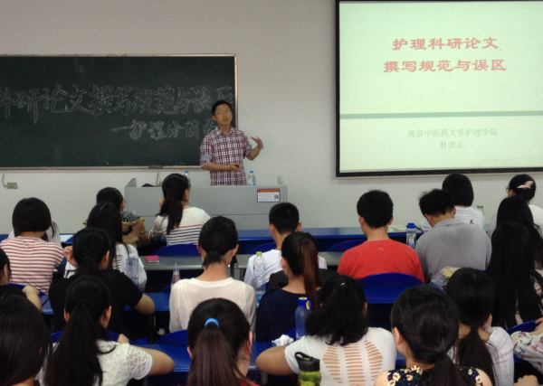 首先,杜老师向大家介绍了国内外护理专业权威杂志。接着,从题目、署名、摘要、关键词、正文和参考文献等六大方面具体讲解了护理科研论文的写作规范与误区。杜老师强调标题是文章的总纲,是读者认识全文的窗口,语词要恰当、简明和准确。围绕前言、材料与方法、结果、讨论和小结等五个方面,杜老师重点而又细致的讲解了如何撰写正文。讲座持续两个小时,现场全程雅雀无声,在持久而又热烈的掌声中圆满结束。