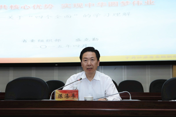 陈涤平书记在总结时指出,盛克勤副部长的辅导报告立意高远、思想深邃、内涵丰富, 既具有深厚的理论功底,又对党和国家的历史、形势、政策分析得准确透彻,从全球的视野、世界的格局来精辟分析、娓娓道来,使大家对“四个全面”战略布局有了全面的认识和理解。陈书记强调,深入学习贯彻“四个全面”战略布局,全面推进我校各项工作是当前及今后一段时期全校工作的重点,大家要认真学习、消化盛部长的辅导报告,把贯彻落实“四个全面”战略布局与学校的工作实际紧密结合起来,与即将开展的“三严三实”专题教育工作紧密结合起来,为建设“国际著名、国内一流”中医药大学和“经济强、百姓富、环境美、社会文明程度高”的新江苏作出新的贡献!