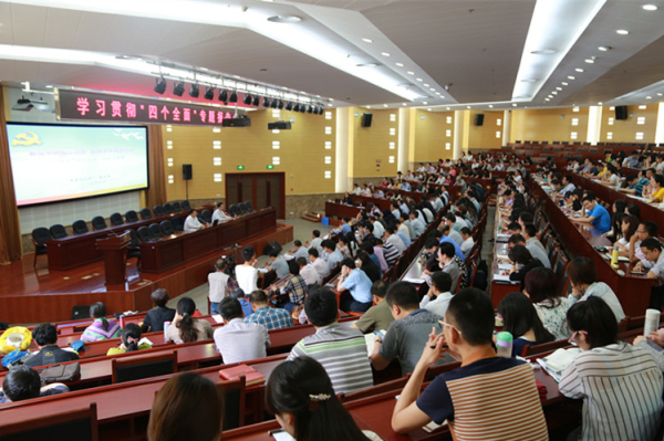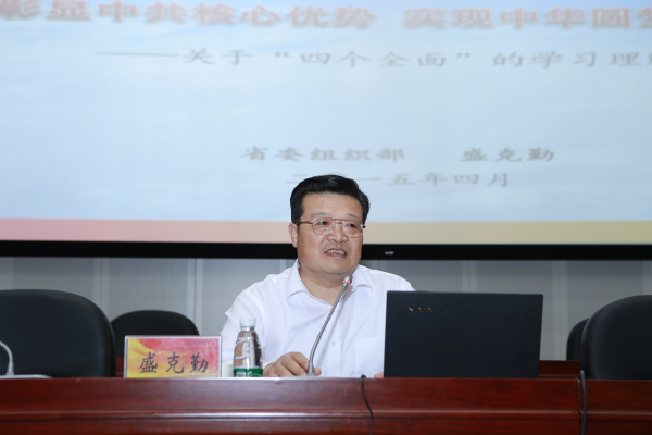 为更好地深化学习、推动工作,按照省委统一部署,5月19日下午,我校在丰盛搂学术报告厅举行了学习贯彻“四个全面”专题报告会,江苏省“四个全面”宣讲基层行活动宣讲专家、中共江苏省委组织部副部长、省委党建办主任盛克勤同志应邀来我校为师生作了题为《彰显中共核心优势实现中华圆梦伟业——关于“四个全面”的学习理解》的专题辅导报告。报告会由校党委陈涤平书记主持,在校校领导,全体中层干部,各级人大代表、政协委员、各民主党派负责人,机关科级干部,各学院教研室主任、“两课”教师、辅导员,学生代表近300人到会并聆听了报告。