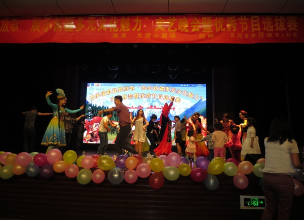 晚会以一支充满浓郁民族特色、场面华美的《刀郎舞》开场,迅速便让现场观众感受到了不一样的西域风情;《花腰带舞蹈》是一支情景故事舞蹈,女演员优美的舞姿与男演员们俏皮的表演相得益彰;民族舞蹈串烧展示了新疆多个民族的舞蹈特色;民族服装秀让大家了解到不同民族服饰的标志性元素。晚会还邀请了河海大学民族音乐社团和我校健美操队友情演出。整场晚会节目精彩纷呈,座无虚席,观众掌声不断、意犹未尽。晚会在演员和观众的即兴共舞中圆满结束。