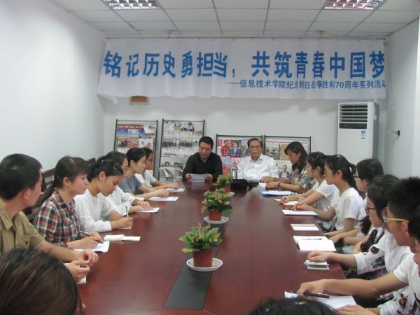 6月3日下午2:30,信息技术学院与离退休工作处合作举办了“听老校长谈抗战精神”座谈会。座谈会在汉中门校区离退休工作处会议室举行,主讲人是亲历过抗日战争,并拥有丰富教育教学经验的离休干部陈德华老校长。离退休工作处沈强副处长、钱伟老师及信息技术学院学工办主任沈静老师出席,党务秘书吴娱老师任主持人。信息技术学院20余位学生代表参加座谈,他们中有学生党员,有入党积极分子,也有普通同学,他们都主动要求来到汉中门校区,听听老干部的人生阅历和他对抗战精神的独到见解。
