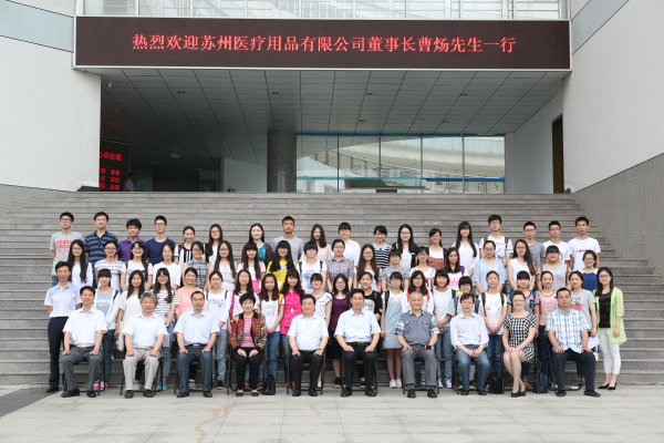 6月10日下午,我校2014年度华佗奖学金颁奖典礼在行政楼416会议室举行。苏州医疗用品厂有限公司董事长曹炀先生、副总经理邢鲁栋先生,党支部副书记包招香女士及其公司相关领导,我校党委王长青副书记、副校长,党办、学工处、研究生院、第二临床医学院有关领导及全体获奖同学参加了典礼。典礼由学工处王九龙处长主持。