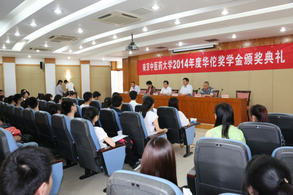 包招香书记宣读了《关于表彰2014年度华佗奖学金获得者的决定》,与会领导分别为获奖研究生和获奖本科生代表颁发证书,研究生院朱诗慧同学、经贸管理学院王若晨同学分别代表获奖同学发言。会上,曹炀董事长首先向获奖同学表示祝贺,他简要介绍了公司的发展历程和相关情况,指出在当今大健康产业构建发展时期,中医药产业将迎来难得的历史发展机遇,这将为南中医学子们提供广阔的发展平台,曹炀董事长表示公司选择在南中医设立奖学金,一方面是对品学兼优的学生进行鼓舞激励,另一方面也是通过此举架起学校与企业之间合作沟通的桥梁,推进校企深度合作为企业发展凝聚力量。