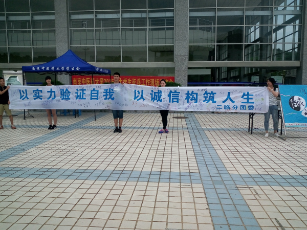 6月12日中午,第二临床医学院分团委在大活北广场举办了以诚信考试为主题的双学活动。活动吸引了不少包括二临各团支部在内的学生,他们共同在活动横幅上签名留下了自己的诚信承诺。