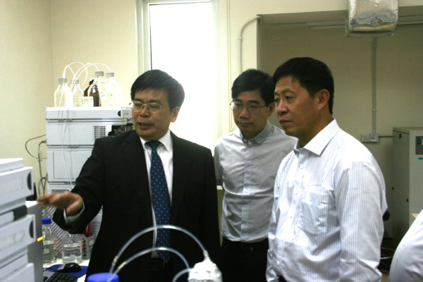 胡刚校长在澳门科技大学刘良(左一)校长的陪同下参观该校国家重点实验室