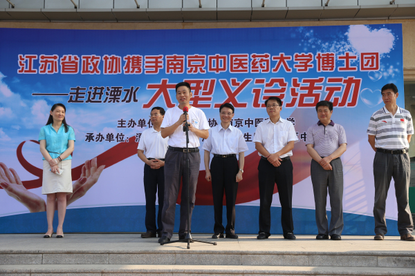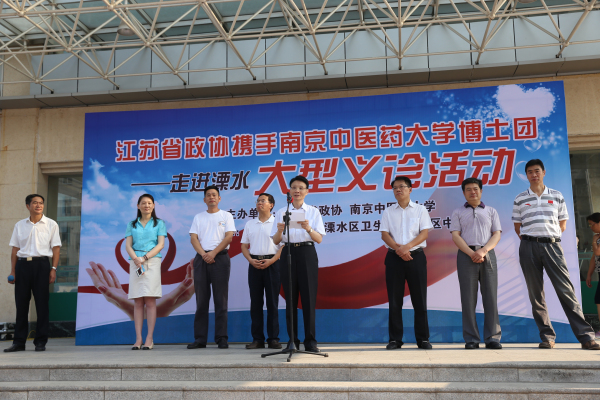 2015年8月27日上午,江苏省政协携手南京中医药大学博士团走进溧水开展了以“心系百姓健康,中医走进基层”为主题的大型义诊活动,活动得到了溧水区政协、溧水区卫生局和溧水区中医院的大力支持。省政协副主席、党组副书记何权,省政协副秘书长、研究室主任程玉松,省政协常委、医卫体委员会主任李一宁及溧水区政府、溧水区政协领导出席了启动仪式。何权副主席在讲话中对义诊活动的意义给予了高度肯定,何主席说:组织专家赴基层为民义诊,是用实际行动积极投身到推进基层医疗卫生服务体系建设中的实事,为保障和增进人民健康、推动医药事业繁荣发展作出积极贡献。
