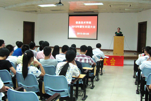 9月8日下午,信息技术学院在大学生活动中心217报告厅举办2015级新生欢迎大会。大会由学院蔡爱华书记主持,胡孔法院长,学工办沈静老师、刘叶兰老师,院办吴娱老师以及本届学业指导教师翟双灿老师、李刚老师和李新霞老师出席大会。