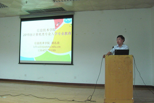 胡孔法院长从学校、学院和专业的概况、发展历程等为切入点,为全体新生做了计算机类入学专业教育。胡院长向新生们介绍了计算机类专业的行业背景、大学四年将学习哪些课程、毕业后的主要就业方向等同学们非常关心的问题,同时也对同学们提出了4点希望:一是要调整心态,转变角色,尽快适应大学学习生活;二是要热爱自己的专业,追求知识、能力、素质的全面发展;三是要学会独立思考、独立判断和独立分析的能力,还要学会包容与合作;四是要树立远大的理想和正确的人生观,学会自我规划和自我管理。