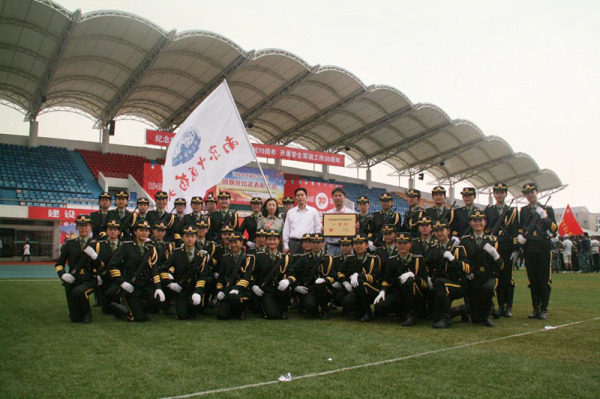 我校女子国旗班在大比武中以整齐的步伐、英武的身姿、恢宏的气势夺得佳绩,荣获大比武一等奖。校党委王长青副书记、副校长出席了大比武表彰大会并慰问了女子国旗班成员。