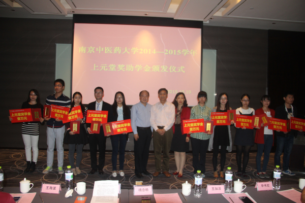 10月19日下午,2014-2015学年上元堂奖助学金颁发仪式在南京上元堂有限公司举行。南京上元堂医药股份有限公司董事长杨念明先生及其公司高管团队,南京市江宁区慈善总会王加法会长、毕书宏副会长,我校党委王长青副书记、学工处屠宏斐副处长、药学院王海波副书记等出席颁发仪式。颁发仪式由学工处王治世副处长主持。