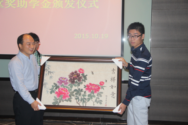 颁发仪式在同学们热情的掌声中开始,南京上元堂医药股份有限公司人力行政部副总经理沈磊先生首先宣读了2014-2015学年上元堂奖学金、上元堂博爱助学金获得学生名单,随后,上元堂奖学金获得者依次登台就个人申报情况做PPT汇报,主席台领导和嘉宾为获得奖学金的学生颁发荣誉证书和奖学金,为获得博爱助学金的同学颁发助学金,第一临床医学院张嘉裕同学代表受助学生作了发言,表达了受助同学直面困难、勇于挑战、自强不息的共同心声。会上,获奖学生代表还向南京上元堂医药股份有限公司赠送了由我校学生创作的书画作品《吉祥如意牡丹图》。