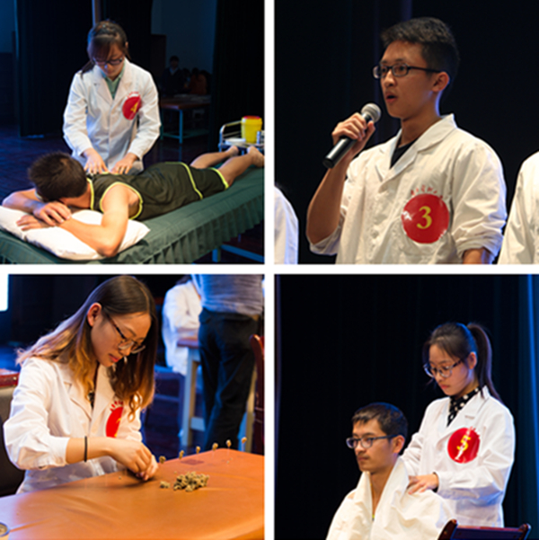晚六点半,随着一枚闪闪发亮的针沉稳而轻巧地刺入模特的穴位,决赛正式开始。大赛分为腧穴定位与刺法、温针灸、推拿操作、经典原文背诵及风险题五部分,环环紧扣,精彩纷呈,8位选手进行了激烈的角逐。
