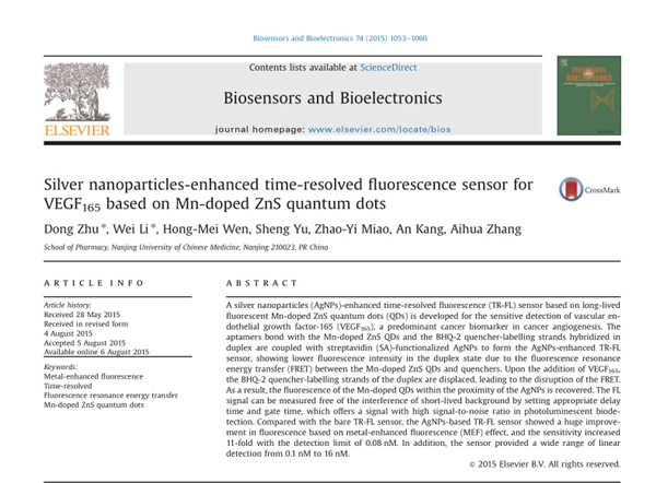 近期,药学院朱栋副教授以第一作者身份,南京中医药大学为作者单位在国际生物传感领域核心期刊《BIOSENSORS & BIOELECTRONICS》上发表了题为“Silver nanoparticles-enhanced time-resolved fluorescence sensor for VEGF165 based on Mn-doped ZnS quantum dots”的研究论文,该期刊最新影响因子为6.409。