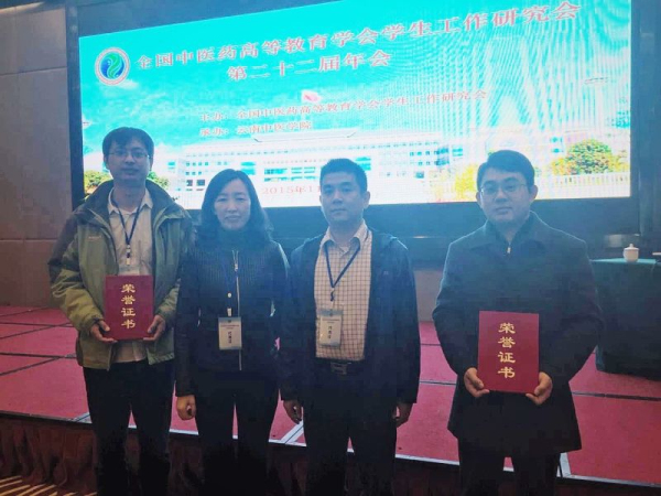 年会对2014-2015年度全国高等中医药院校优秀辅导员、优秀论文获奖者进行了表彰,公布了第二十二届年会科研项目立项评审结果。我校药学院辅导员牛浩老师、第一临床医学院辅导员郁祥老师获“优秀辅导员”荣誉称号;学生工作处张同远副处长的“中医理论与学生工作相结合的研究”课题获科研项目立项。
