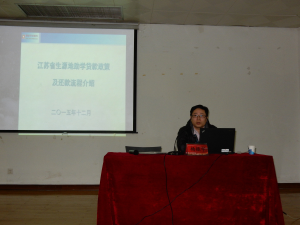 12月9日下午,学工处学生资助管理中心特邀国家开发银行江苏省分行规划发展处杨振宇经理来校做题为“生源地助学贷款政策及还款流程介绍”专题讲座,同学们踊跃参加,大学生活动中心217报告厅座无虚席。近年来,在政府及国家开发银行助学贷款业务的大力推动下,我校申请生源地助学贷款的家庭经济困难学生人数逐年递增,2015年我校共有709名同学成功申请到生源地助学贷款,合计放贷总金额达553万元,目前,生源地助学贷款已成为我校家庭经济困难学生办理助学贷款的主要形式。