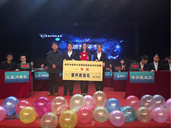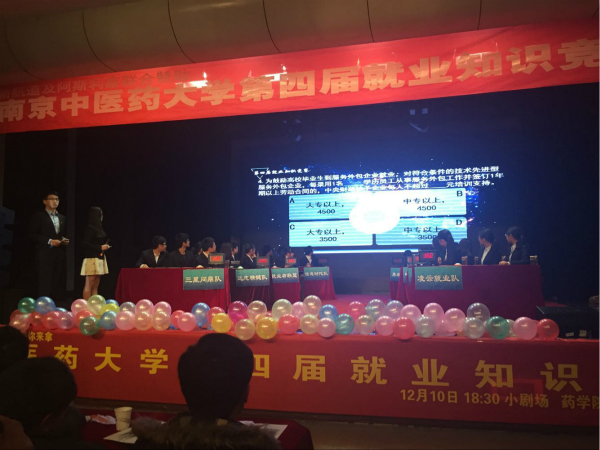 12月10日晚,由我校大学生就业创业指导中心主办,药学院就业与发展协会协办的南京中医药大学第四届就业知识竞赛决赛在大学生活动中心举办。八支队伍经过前期初赛的筛选,于当晚进行总决赛。到场嘉宾有药学院分团委书记牛浩老师、基础医学院学工办陆家康老师;第二临床医学院学工办邵海鸿老师;药学院学工办张赛男老师以及校社团联合会主席吴汉民同学。