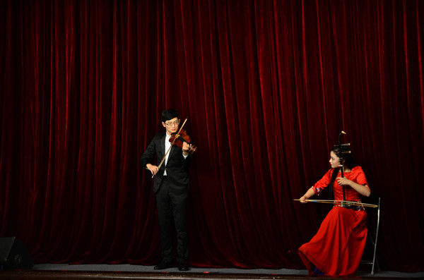 一曲由著名奥地利作曲家瓦格纳创作的《双鹰旗下》拉开了第一篇章《管弦之声》的序幕。乐曲点燃了现场的气氛,那恢弘的旋律,让在场的观众们都被美妙的音符带入了那万马千军的世界。随后,《绿色山谷序曲》的欢快轻盈,《G弦上的咏叹调》淳朴典雅,《一步之遥》和《阿莱城姑娘组曲之小步舞曲》的华丽动人以及《匈牙利舞曲第五号》如美酒般的香醇浓烈更是引人入胜。曾代表学校赴澳洲演出的李松骏老师和戴季悦同学的小提琴、二胡合奏《澳大利亚随想曲》演绎出中西合璧的美妙旋律。曾获全国“青苗杯”歌唱比赛一等奖的校友孙心专程返回母校,为现场观众献唱一曲《板蓝花儿开》。