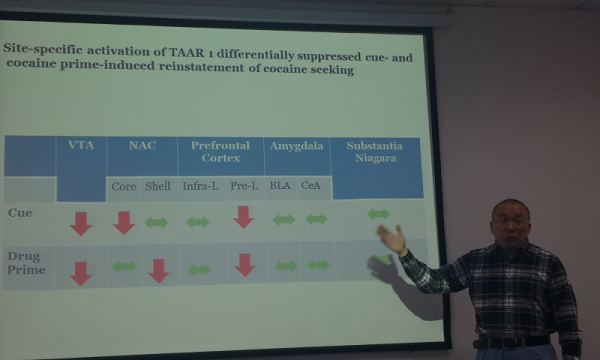 Jun-Xu Li教授首先做了题为“Trace amine-associated recept or 1 as a novel target to treat drug addiction”的讲座。讲座着重讲解了TAAR1受体与可卡因成瘾之间的关系以及TAAR1受体作为一个新靶点治疗药物成瘾方面的行为学证据。
