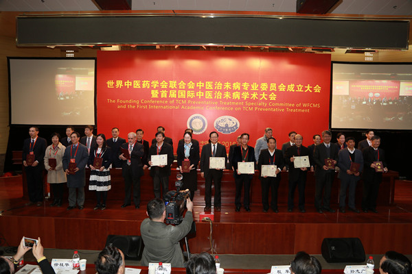 主席台领导为世界中医药学会联合会中医治未病专业委员会各位副会长颁发证书