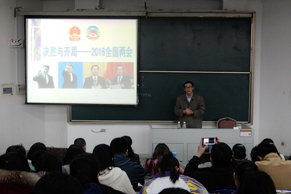 王教授从经济增长、供给侧结构性改革、新经济、加强政府自身建设及反腐倡廉等10个两会重要议题,带着大家了解了我国下一个五年的重点发展目标、发展趋势和发展领域。王教授特别提到了以信息技术和网络技术等现代科技推动的生产、管理和营销模式的巨大变革,并勉励信息技术学院的学生一定要扎实学习专业技术,在这样一个大时代背景下,必将有所用、有所为。随后,王教授又给大家解读了《“十三五”规划纲要》中的亮点内容,特别是收入、医疗、治污这样的关键词,让在座师生都看到了国家对民生的关注和改善的决心,坚定了实现“中国梦”的信心。