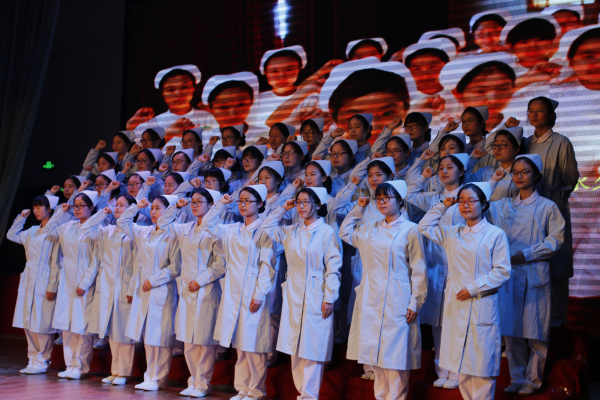 授帽仪式在优美的手语舞蹈——《天使的翅膀》中拉开帷幕,12名护生翩翩起舞,展现了当代护生的青春活力。接着,徐校长为活动致辞,热情洋溢的话语中饱含对即将实习的护生的期望与祝福。在班级展示环节中,各实习班以视频形式叙述了他们与众不同的“青春回忆录”。数年的大学生活,老师的关心与爱护、同窗的安慰与陪伴、亲友的理解与支持,都将成为每个人难以割舍的财富和砥砺前行的动力。有梦想的人总是积极向上的,大学三年,同学们用自己的努力为班级赢得了荣誉,同时也收获了友谊与快乐。之后,在庄严的音乐中,授帽仪式正式开始,学业指导老师们为每位护生戴上圣洁的燕尾帽,这标志着他们即将走上临床,正式成为一名救死扶伤的白衣天使。全体护生在13护理2班严姝霞老师的带领下郑重宣誓,他们用蓬勃的热情表现出对护理行业的信心与期望,用高亢的誓言传达了他们身为一名护理人员的决心与爱心。