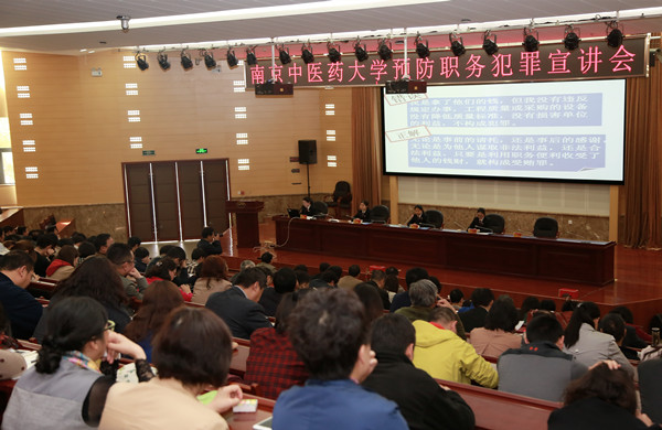 4月18日下午,应学校邀请,南京市预防职务犯罪宣讲团一行五人,在团长南京市人民检察院职务犯罪预防局副调研员陈国军带领下,来我校作预防职务犯罪专题报告。鼓楼区检察院职务犯罪预防局局长顾丽娟、检察官张杰出席会议。全体在宁校领导,全体中层干部,全体科级干部,各部门、各学院、各单位党务、行政秘书,教研室主任,学科带头人,兼职监察员、特邀监察员300多人出席报告会。会议由纪委副书记林正兴主持。