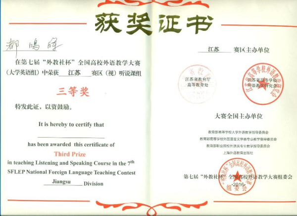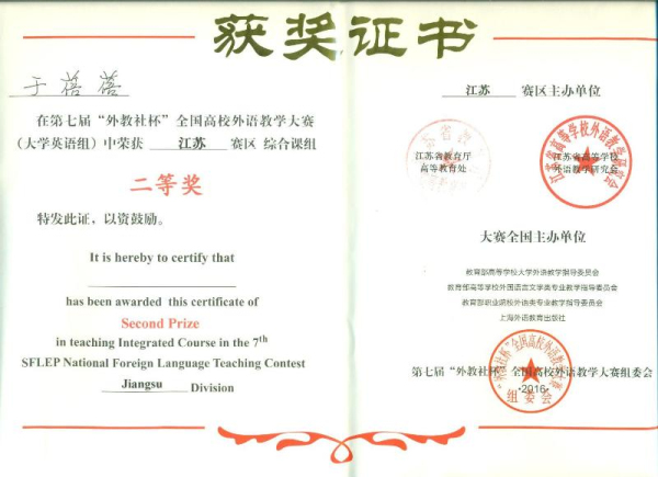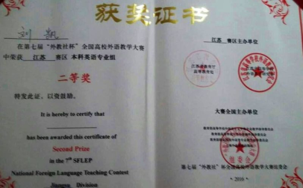 近日,从第七届“外教社杯”全国大学英语教学大赛江苏赛区组委会传来喜讯,我院选送的三位选手刘凯、于蓓蓓、都鸣晖老师表现出色,分别获得本科英语专业组、本科综合组和本科视听说组江苏省赛区决赛二等奖、二等奖和三等奖;朱清老师获得优秀指导教师奖。