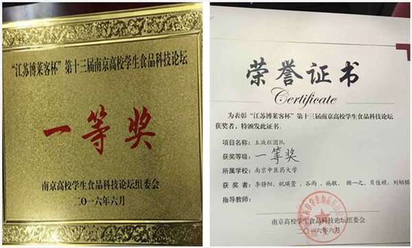 近日,从“江苏博莱客杯”第十三届南京高校学生食品科技论坛组委会传来喜讯,我校药学院食品质量与安全专业李静阳、祝瑛萱、谷雨、施敏、顾一之、贝家桢、刘栩铭同学组成的玉液糕团队和张佳妮、李晓东、虞晓婷、陆丽莎、周洁同学组成的乐思团队分别获得大赛一等奖和二等奖。
