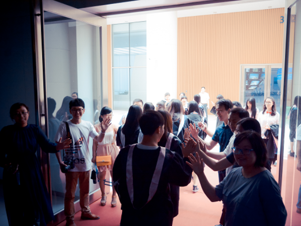 毕业班辅导员、班主任在会场外列队与同学们击掌告别