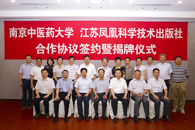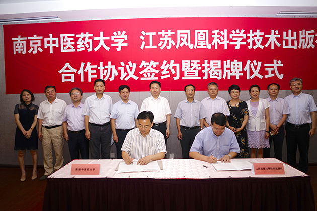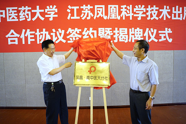 在与会领导的见证下,谭仁祥副校长代表学校与金国华副总经理签订战略合作协议,校党委陈涤平书记与张建康董事长共同为“凤凰·南中医大分社”揭牌。