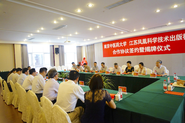 仪式上,江苏凤凰出版传媒股份有限公司副总经理兼江苏凤凰科学技术出版社有限公司社长佘江涛介绍了校社双方合作和成立“凤凰·南中医大分社”的内容和意义。南京中医药大学作为全国建校最早的高等中医院校之一,校史久远,名家辈出,硕果累累,影响卓著,被誉为“中国高等中医教育的摇篮”,目前正处于蓬勃发展的态势,综合排名已跃居全国中医药院校榜首。同样江苏凤凰出版传媒集团综合实力位居国内第一、世界第六。江苏凤凰科技出版社综合实力位居全国科技类出版社前列、地方科技类出版社第一。南京中医药大学一直是苏科社长期的出版根据地,多年来在苏科社出版古籍丛书、孟和四家医集、吴中医集等诸多中医名家专著和临床诊疗丛书。今天校社双方建立战略合作关系,成立“凤凰·南中医大分社”,有利于共同打造中医药出版重大工程,建设纸质和数字相结合的专业立体化出版,推动中医药文化和专业内容的传播,树立合作双方在国内外中医药行业的权威性,扩大合作双方在专业和公众领域的影响力。