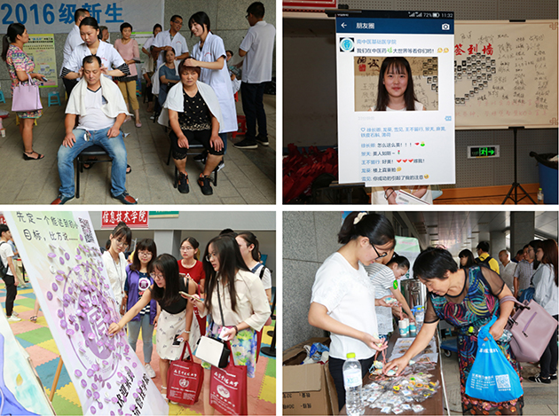 报到现场,各学院开展了丰富多彩的特色活动,向新生和家长展示学院、专业优势、传播中医药文化。在家长休息区,由基础医学院、第二临床医学院、药学院学生组成的志愿服务队,向家长提供免费的驱蚊薄荷膏、中医推拿服务、中药药茶和中药灯谜,让新生家长在体会贴心服务的同时,也能感受到中医药的博大魅力。团委在报道现场开辟了学生证团员证留影区;基础医学院设立了朋友圈照片墙;医学与生命科学学院向新生赠送了印有校院领导、学科带头人、专业老师寄语的书签;第一临床医学院采用当下学生最喜爱的直播形式,组织了“女神学姐带你逛校园”的直播活动;第二临床医学院通过发放资料、学业指导老师见面会等形式向新生及家长介绍专业,并招募了一批高年级维吾尔族学生志愿者帮助新疆籍少数民族新生;药学院邀请胡刚校长亲自为新生家长上了一堂生动的“新生家长开学第一课”;卫生经济管理学院向新生赠送了“先定个小目标”挂件;护理学院开展了“与未来握手”护理职业教育体验活动、“护理教学实验中心家长开放日”活动;外国语学院向新生赠送了展现异域风情的折页和日历,并组织留学生志愿者接待新生;信息技术学院全体学业指导老师全程参与新生报到、与新生及家长沟通;心理学院心理学院结合专业特点,专门制作带有心理学院标志的21天不抱怨紫手环作为纪念品,发放给新生;研究生院为新生提供“贴心巴士”、“爱心泉水”等服务。
