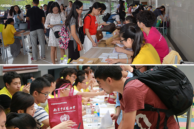新生报到当天,由学校8个学院的老师和学生志愿者组成的接站小分队凌晨六点多便集合奔赴火车站、汽车站、地铁站等交通点接站。校党委陈涤平书记、胡刚校长、黄桂成副校长等校领导和职能部门领导分别前往各接站点,迎接新生及家长、看望慰问接站的老师和志愿者;全体在家校领导和职能部门领导亲临报到现场,慰问迎新工作人员,与新生及家长亲切交谈。报到当天,每位新生都有一名志愿者全程陪同,协助新生办理报到手续、入住宿舍、搬运行李。学工处、团委制作分发了印刷精美的校园指南,详细介绍入学后的日程安排、校园生活信息;保卫处主动联系仙林地区公安系统人员在报到现场向新生及家长宣传安全常识;报到现场专门设立了新生入学“绿色通道”,为家庭困难的学生提供贴心服务,确保他们顺利完成注册报到;迎新现场还首次开放了体育馆二楼的观众台,供家长休息和观摩孩子在场内的报到情况。
