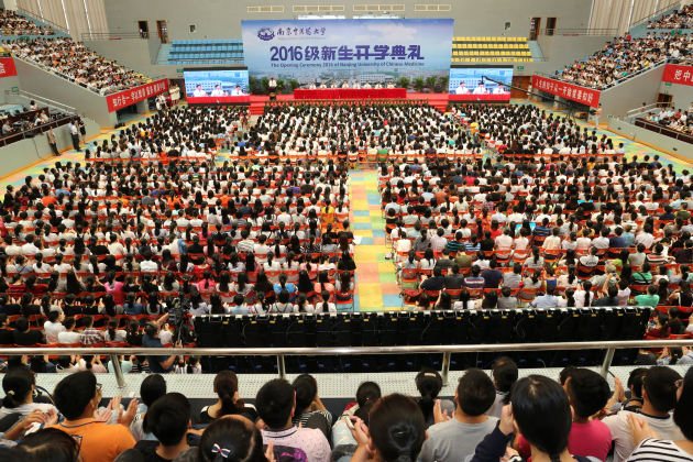9月7日上午,南京中医药大学2016级新生开学典礼在仙林校区体育馆隆重举行。校领导陈涤平、胡刚、王长青、张策华、黄桂成、方祝元、程革等出席开学典礼,学校教师代表、校学生工作领导小组成员、各学院党政负责人、辅导员、学业指导老师、部分新生家长以及全体2016级本科生、研究生、留学生新生参加典礼。典礼由王长青副书记、副校长主持。