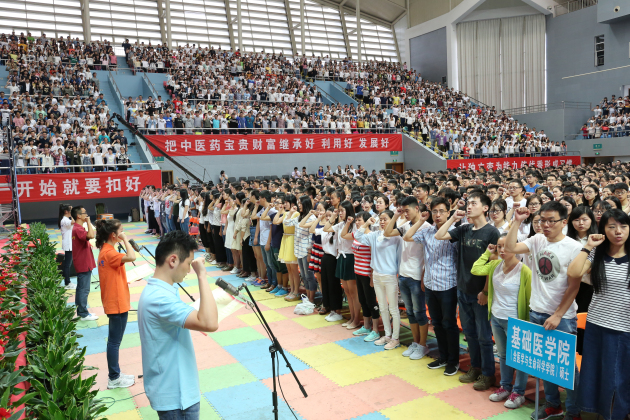“胸怀崇高理想,牢记神圣职责,勇担复兴使命,报效伟大祖国。尊师敦友爱校,明德求真务实,全面成长成才,服务社会大众。为弘扬南中医精神,传承南中医薪火,振兴祖国健康事业而奋斗!”3900余名新生在学长代表的带领下,举起右手,庄严宣誓。最后,全体师生合唱《南京中医药大学校歌》,开学典礼圆满落下帷幕。