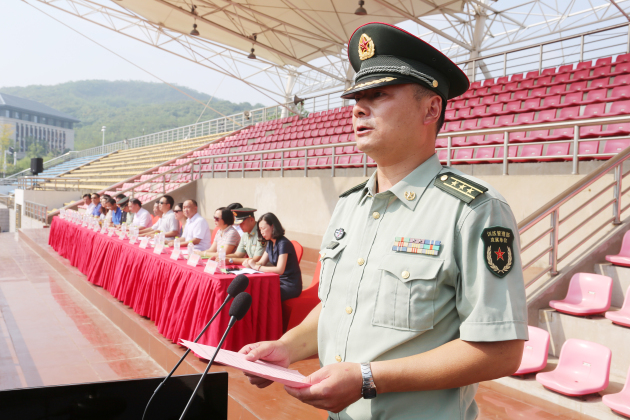 随后,军训团参谋长赵晗少校宣读了军训团编成和军训实施计划;军训团副参谋长陈晨代表全体教官发言,阐述了军训的意义,并号召全体教官,认真负责、循序渐进、因人施教、科学训练,不负学校领导和老师们的重托,圆满完成此次军训工作。胡金宝同学代表2016级新生郑重宣誓:珍惜军训的经历,不怕苦、不怕累,以昂扬的姿态,完成训练的每一项任务。接着,承训部队教官进行了精彩的科目展示,他们整齐的动作、飒爽的军姿赢得了在场师生们阵阵掌声。