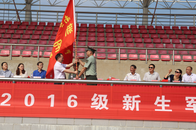 黄桂成副校长向军训团团长王钢上校授军训团团旗